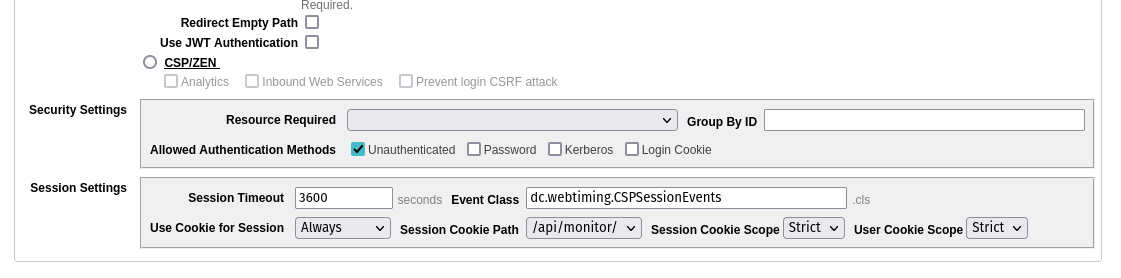 现在我们已经配置了系统,还需要解决一个重要的细节,以便您能够记录测量结果。要了解您需要做什么,您应该了解系统如何工作。为了触发测量和记录,web-timing-logger 使用事件“OnStartRequest”和“OnEndRequest”。这些事件在类“dc.webtiming.CSPSessionEvents”中实现,该类是“%CSP.SessionEvents”的子类。因此,每个 Web 应用程序都必须配置事件类“dc.webtiming.CSPSessionEvents”。