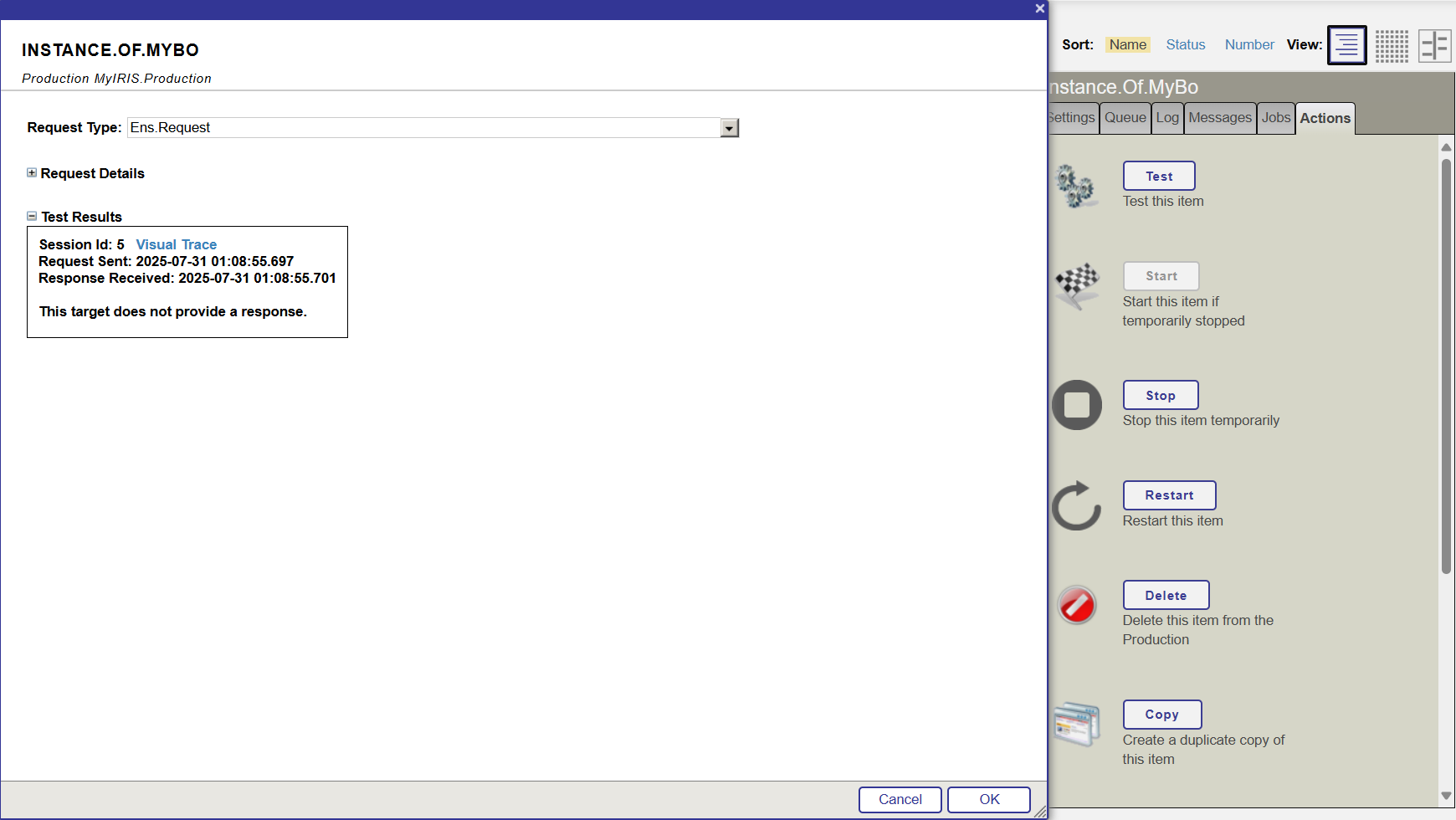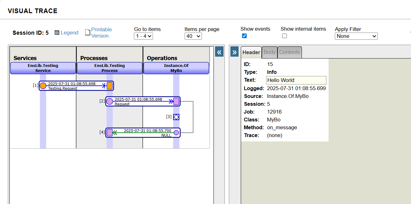 选择 Ens.Request 作为请求类型,点击调用测试服务(Invoke Testing Service)按钮,然后点击视觉跟踪(Visual Trace),查看详细信息:
