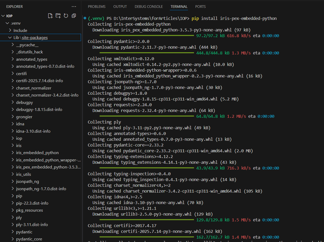 首先,设置一个 Python 虚拟环境来隔离项目的依赖项,确保与 IoP 和 InterSystems IRIS 兼容。 虚拟环境是一个具有特定 Python 版本和项目所需软件包的自包含目录。 这种设置可以避免与其他 Python 项目发生冲突,并简化开发过程。 对于本教程,创建一个名为 IOP 的文件夹来存放项目文件。