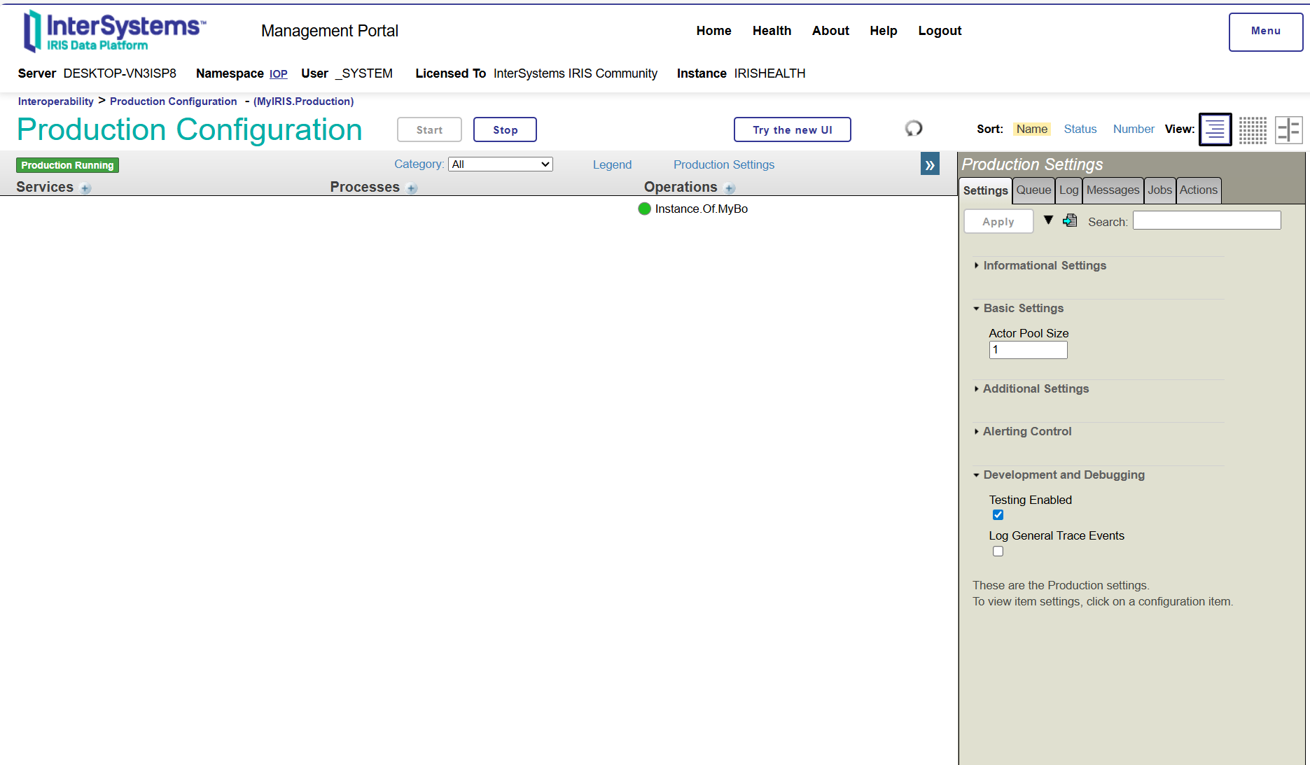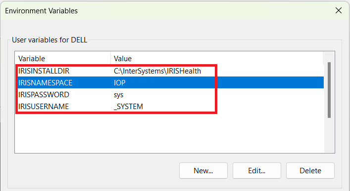 要将 IoP 项目连接到 InterSystems IRIS,您需要配置环境变量以指定连接详情。 在本教程中,对于本教程,我们将使用一个名为IOP的、启用了互操作性的命名空间来运行本地IRIS实例: