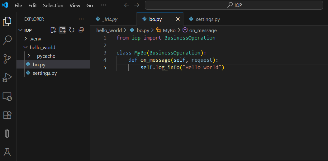 在此文件中,我们在 IRIS 中导入名为 MyIRIS.MyBo 的 MyBo 类,并将其添加到 CLASSES 字典。