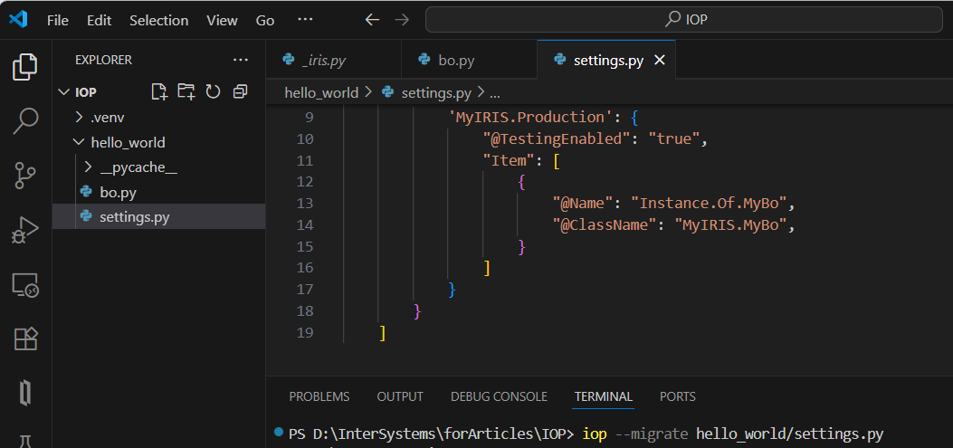 要将 IoP 组件迁移到 IRIS 中,我们需要在名为 settings.py 的 hello_world 文件夹中创建一个新文件。