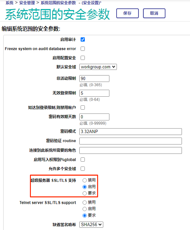 - 在管理门户中,通过路径 系统 > 安全管理 > SSL/TLS 配置,在超级服务器SSL/TLS支持 选项上选中“要求”。它的三个选项分别为: