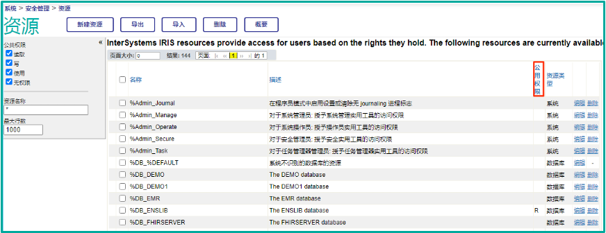 通过管理门户>系统>安全管理>资源,管理可以创建新资源、配置已有资源的权限。