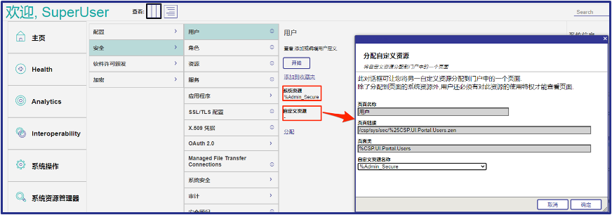 为了提供更细颗粒度的管理,除了配置给管理门户页面上的系统资源,用户可以将自定义资源加到管理门户页面上。这样,用户需要同时具有系统定义的页面资源权限和用户自定义资源权限才能访问和使用管理页面。