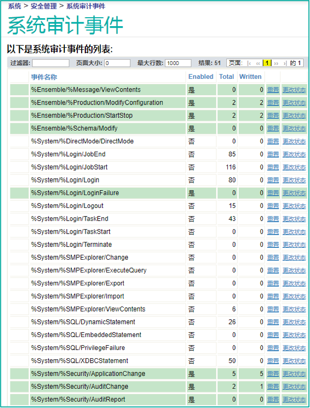 InterSystems数据平台预置了一系列系统审计事件,例如用户登录事件、登录失败事件等。并非所有的预置系统审计都默认开启,用户可以在系统审计事件配置页面进行配置,决定审计哪些系统事件。