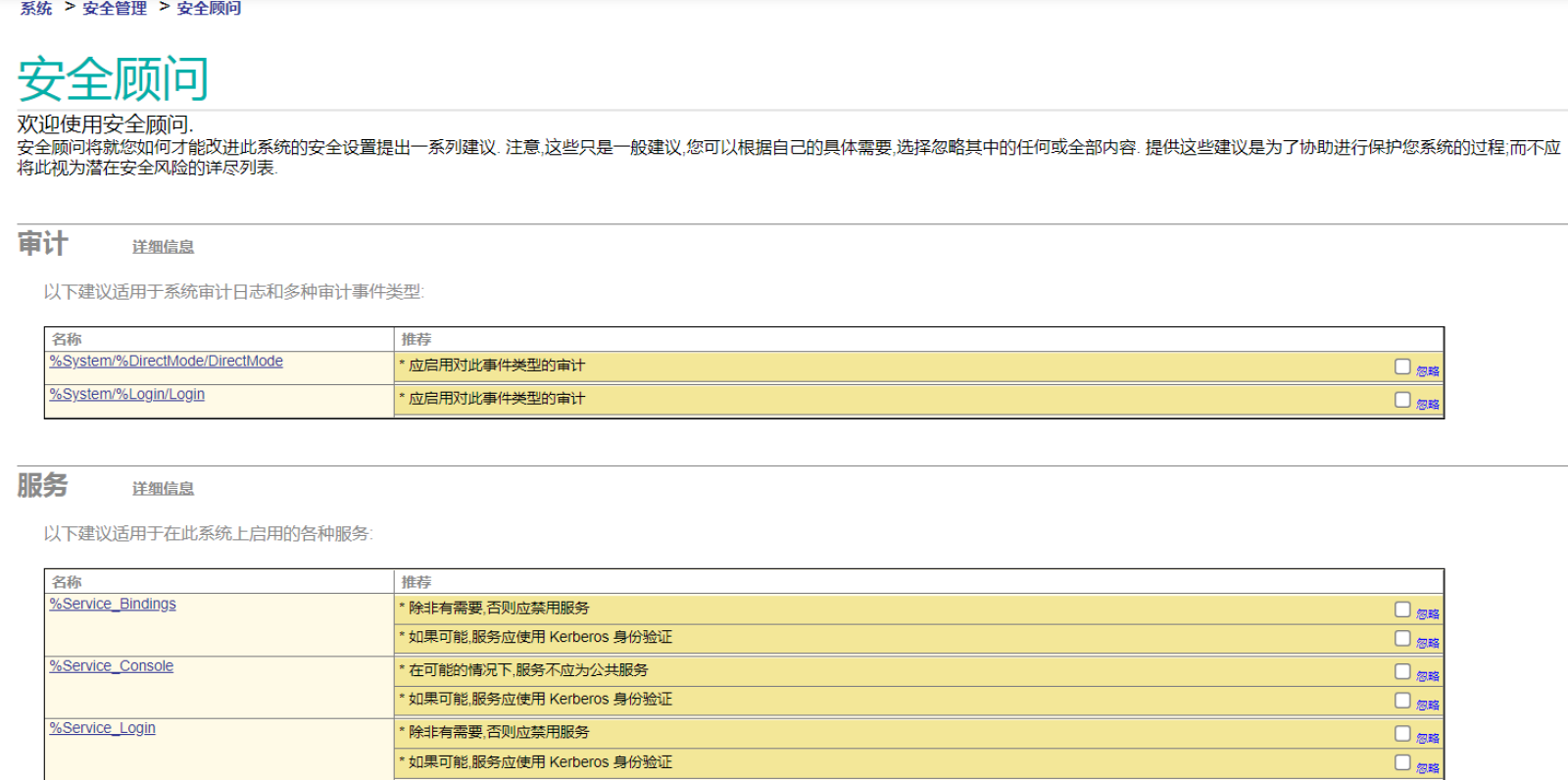 InterSystems数据平台提供安全检查和建议工具。通过管理门户 >系统 > 安全管理 > 安全顾问 即可使用该工具。