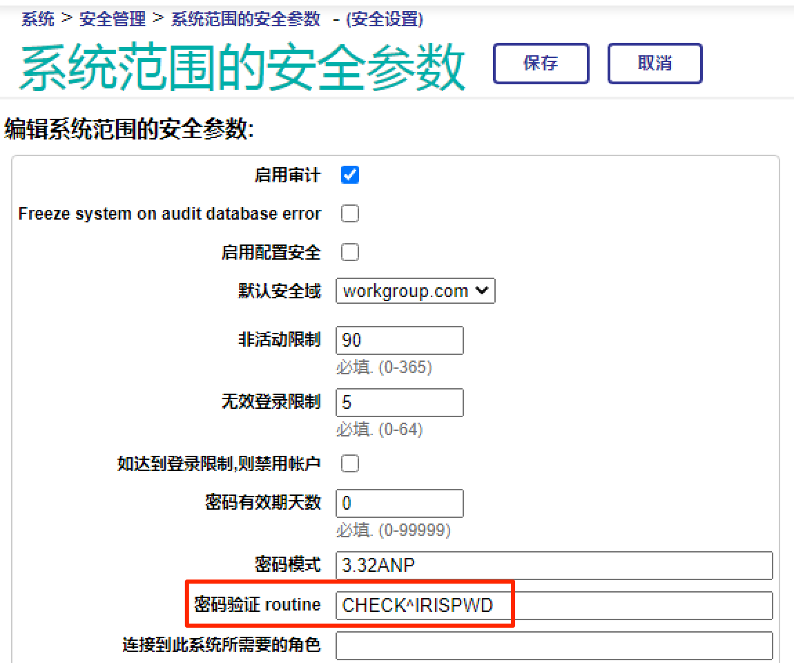 }然后将方法调用的名称更新到“系统范围的安全参数”中的密码验证routine中。方法调用名称是方法名^Routine名,本示例为CHECK^IRISPWD。