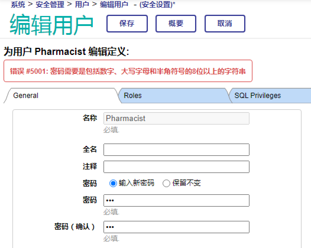 设置好后即可生效,但要注意它不会对旧有密码进行验证。当设置或修改用户密码后保存时,它会进行检查,对违反约束的密码设置,会报如下错误提示: