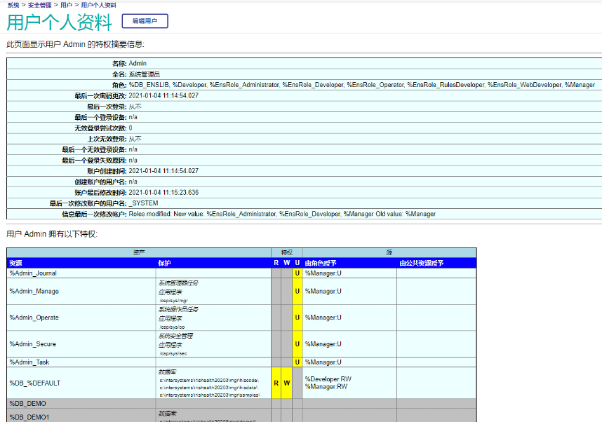 通过管理门户>系统>安全管理>用户,可以创建、管理用户。在这里可以执行每个用户的初始密码设置、账户启用/禁用条件,用户的角色设置、SQL权限等管理。