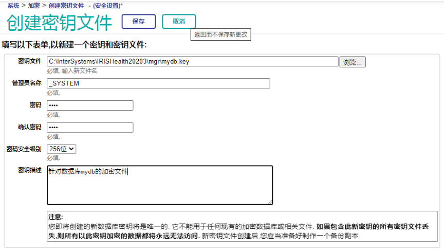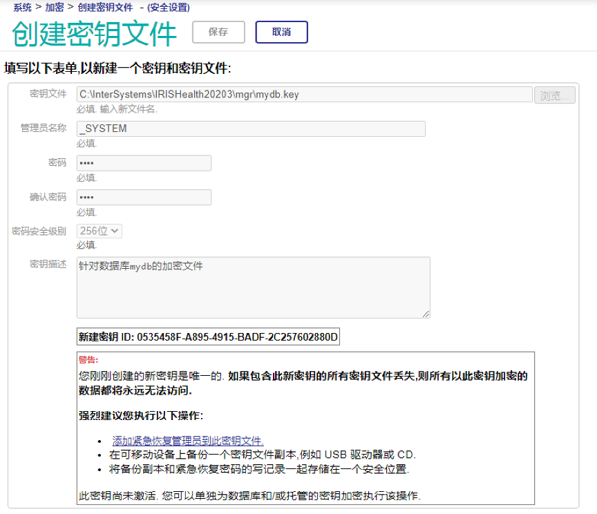 创建一个新密钥文件及新的加密数据库的过程非常简单,在管理门户即可完成: