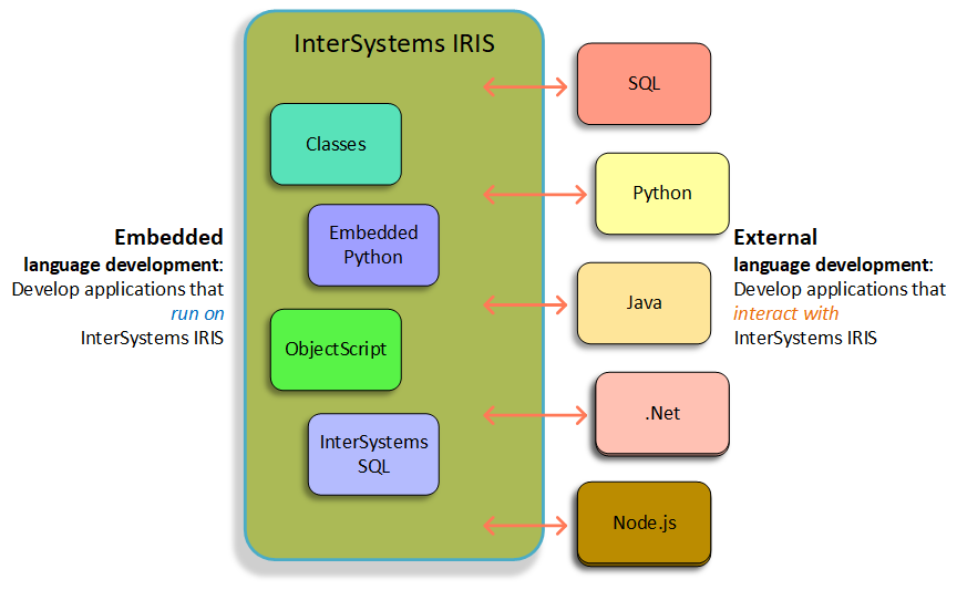 Java.NET Python都是流行的OOP语言。InterSystems IRIS可以直接将Java和.NET对象保存到数据库而无需做对象/关系映射,同时InterSystems IRIS的外部服务器(InterSystems External Servers)特性使InterSystems IRIS和这些OOP语言可以双向使用对方定义的对象。它包括以下特性: