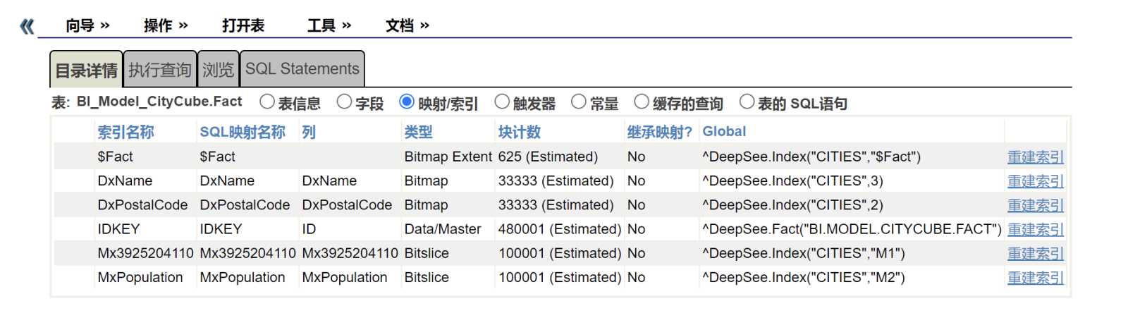 FROM INFORMATION_SCHEMA.INDEXES WHERE NOT Table_Schema %STARTSWITH '%'你可以使用管理界面的目录详情的映射/索引选项列出所选表的索引。这将为每个索引显示一行,并显INFORMATION.SCHEMA.INDEXES没有提供的索引信息。