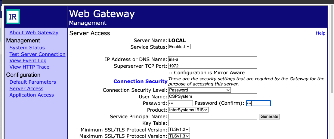 • Server Local的IP/DNS和Port:这里是iris container的名字iris-a,和iris-a container的superserver端口1972