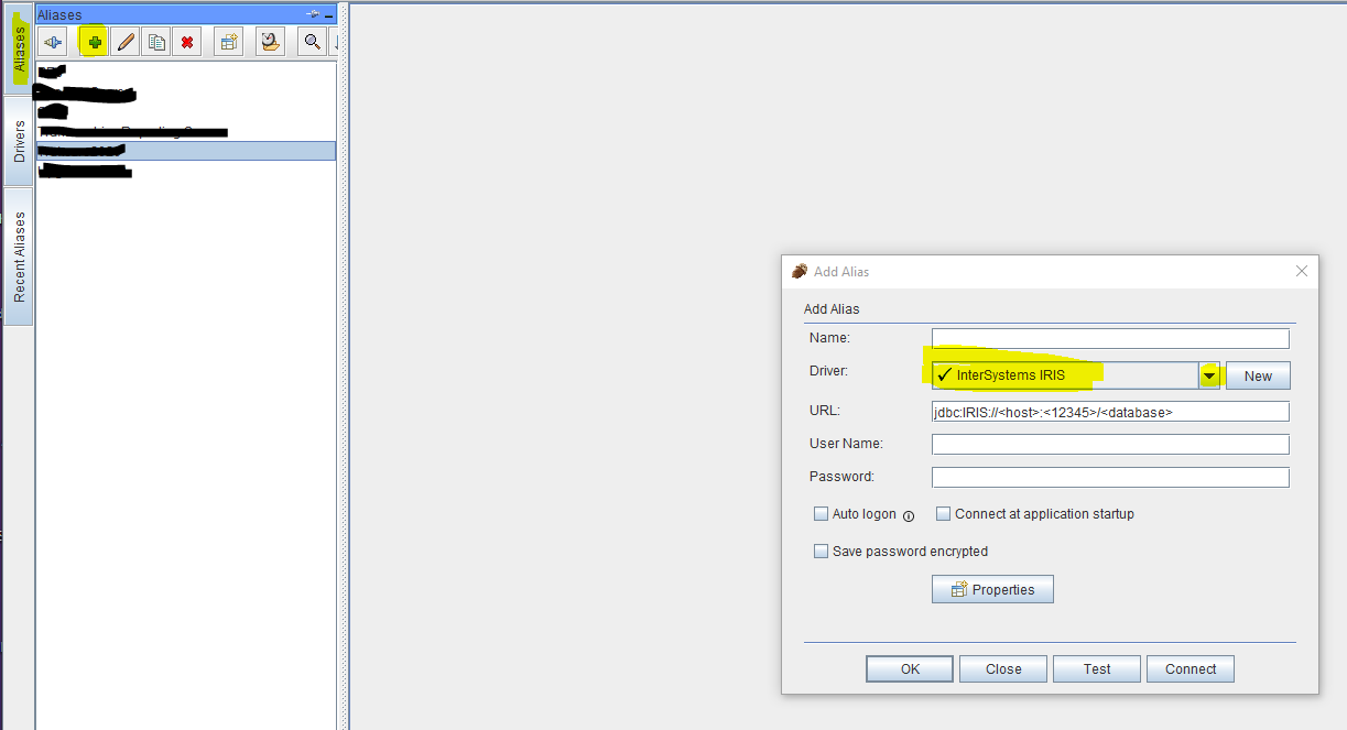 • 选择squirrel sql左侧的“别名”选项卡,点击“+”添加新别名,如下图。
