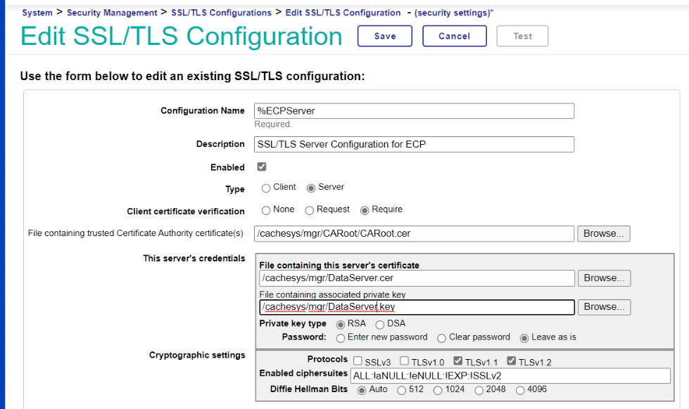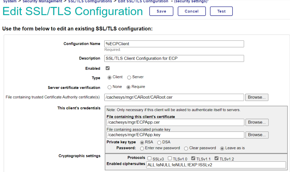 • 通过System > Configuration > ECP Settings - (configuration settings) 下的Edit SSL/TLS ‘%ECPServer’的链接进行配置