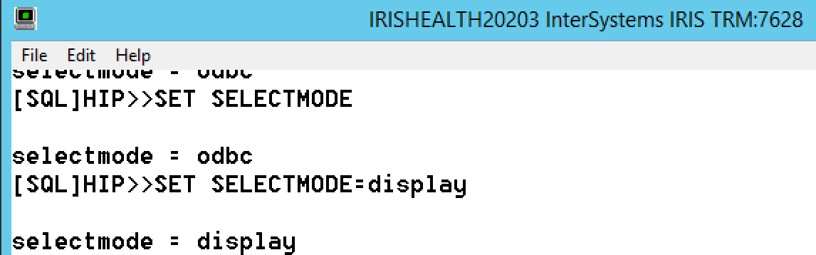 直接使用SET SELECTMODE命令,返回的是当前数据模式。要设置数据模式,使用SET SELECTMODE=odbc/logic/display,例如SET SELECTMODE=odbc将当前SQL操作环境的数据模式设置为ODBC模式。