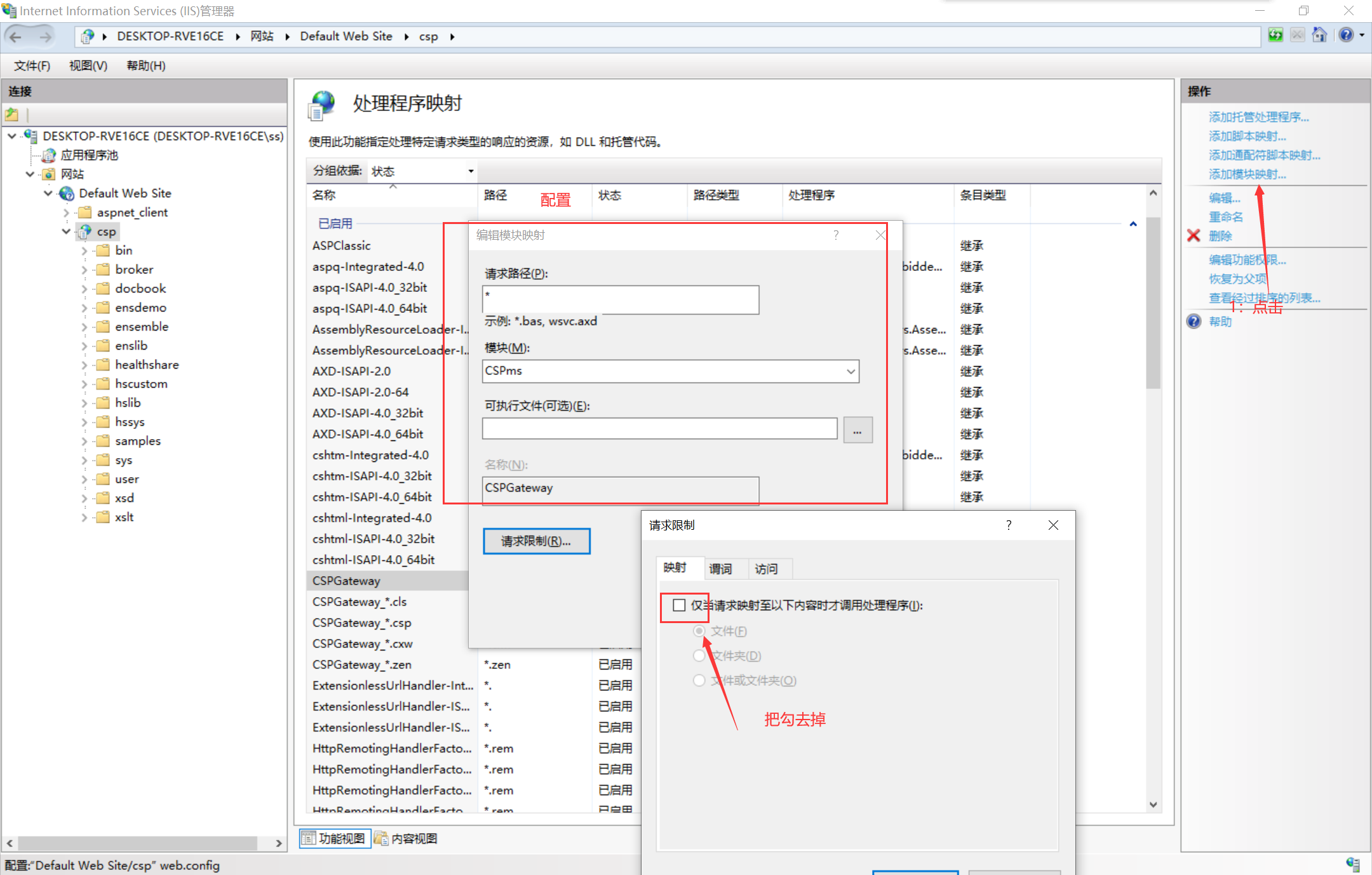 注意:我们从图中看到的CSPms模块是本机继承的模块,我们在右边添加本机模块的时候并不能找到C:\inetpub\CSPGateway\CSPms.dll这个模块,导致加不进去。那我们就直接在配置文件上面改。找到C:\Windows\System32\inetsrv\config该文件路径下的applicationHost.config文件,为了稳妥起见,我们先备份一下该文件。