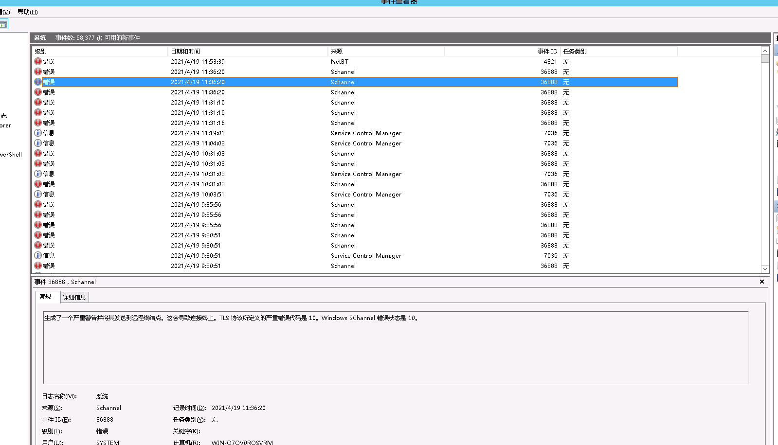 服务器操作系统频繁产生错误日志“生成了一个严重警告并将其发送到远程终结点。这会导致连接终止。TLS 协议所定义的严重错误代码是 10。Windows SChannel 错误状态是 10。” 想请问一下,这个错误信息是我们产品导致产生的问题吗?