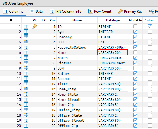DATATYPE_SAMPLE数据库的 "雇员(Employee "表中,有一条被故意篡改的记录可以证明这种行为--它就是ID = 110 的记录。 乍一看,甚至再看一眼,都看不出任何问题。无论是数据库驱动程序还是查询工具,都没有显示读取该记录有问题。