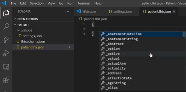 第 2 步: 创建文件夹(在这个例子中,我使用病人文件夹和病人资源),并将提取的fhir.schema.json文件复制到同一文件夹,然后从VS Code中打开文件夹.png)